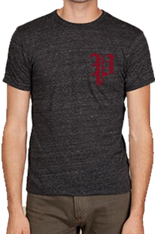 Super soft Heather Black American Apparel Tri-Blend tees sporting the maroon "Old Style P" printed on the left chest. Tagless, printed neck labels.